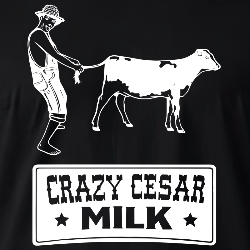 First, the graphic shows the iconic Crazy Cesar milk scene, featuring a humorous farm illustration with a cow and the Crazy Cesar Milk logo. Because of this bold design, the shirt instantly stands out and creates a strong visual centerpiece.