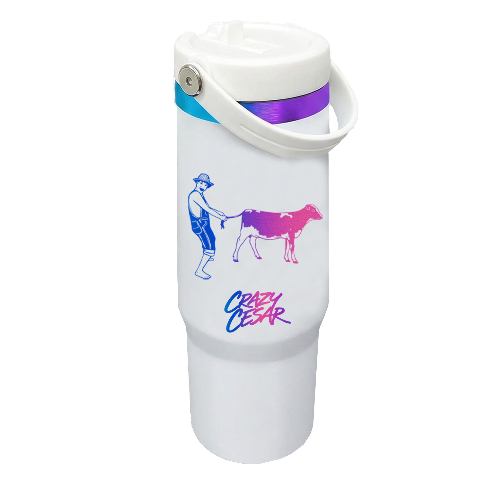 Bring color and personality into your daily routine with this modern insulated tumbler. Designed with a clean white finish and a vibrant rainbow Crazy Cesar logo, this cup delivers a bold and energetic look while maintaining a simple and clean style that fits any setup.